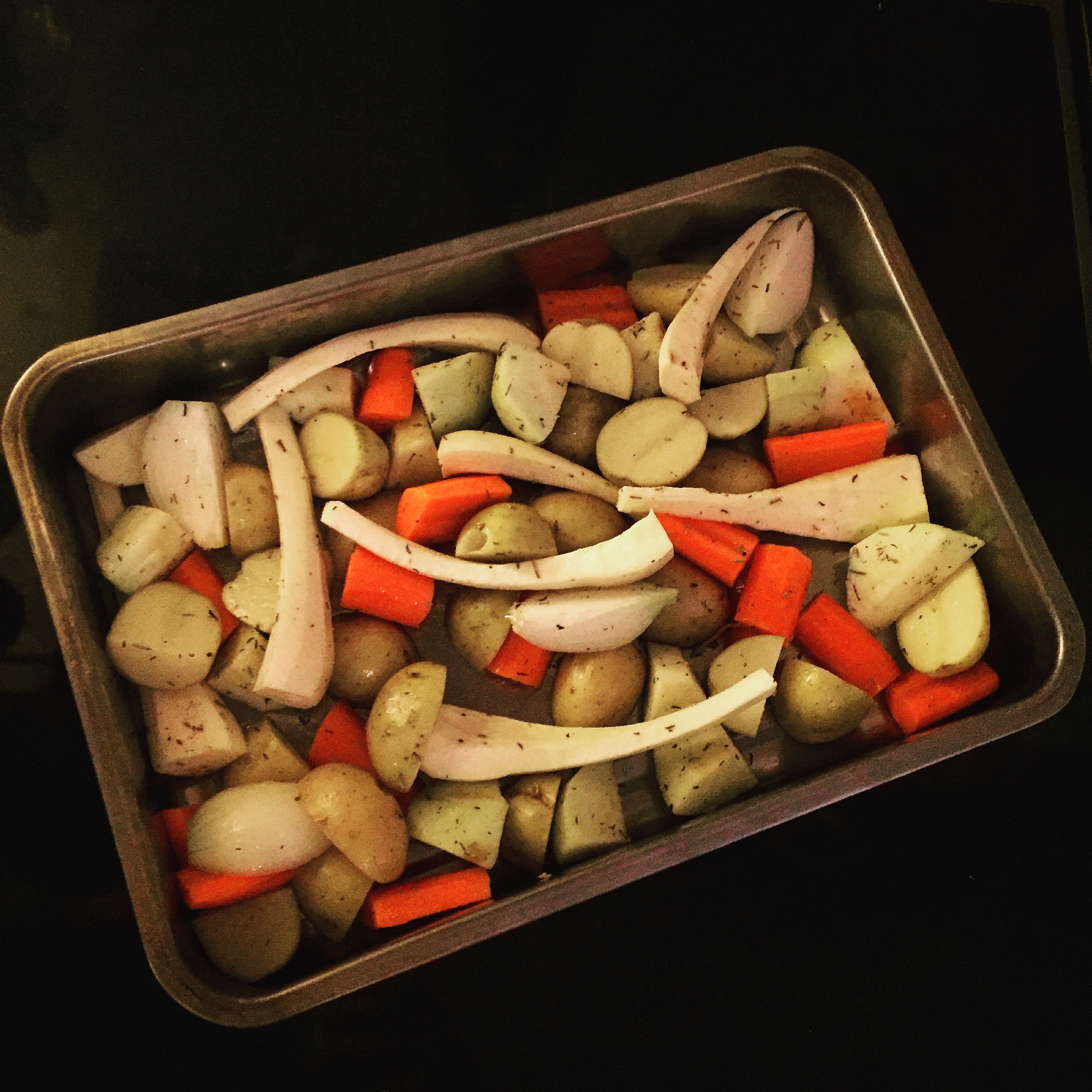 - Chop up all of the vegetables as directed above. Place into a tray and drizzle over the oil, salt, pepper, and half of the herbs. Place into the oven and cook for 10 minutes