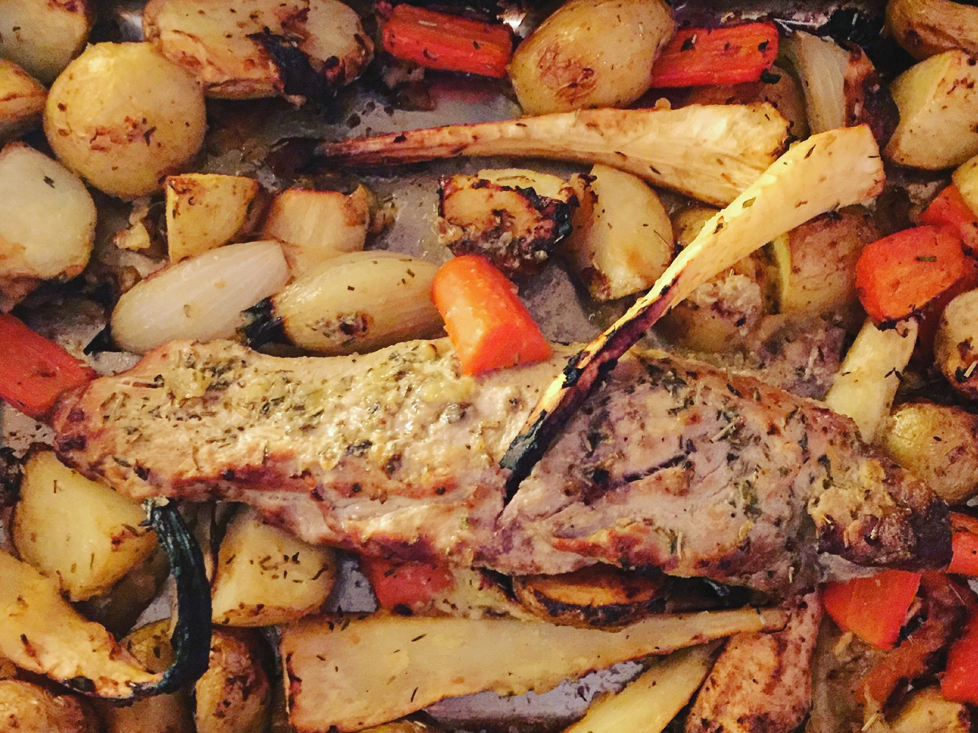 - Take out the tray of vegetables and stir around. Then nestle in the pork fillet in the middle of the vegetables and return to the oven. Leave to cook for 30 – 40 minutes until the pork is cooked through, but still juicy and tender