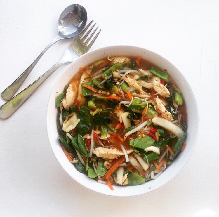 - A mix of vegetables, thinly sliced, such a cabbage, spring greens, pak choi, spinach, edamame beans, green beans, beansprouts, or courgetti noodles…anything you can find that’s sitting in your veg box in the fridge!