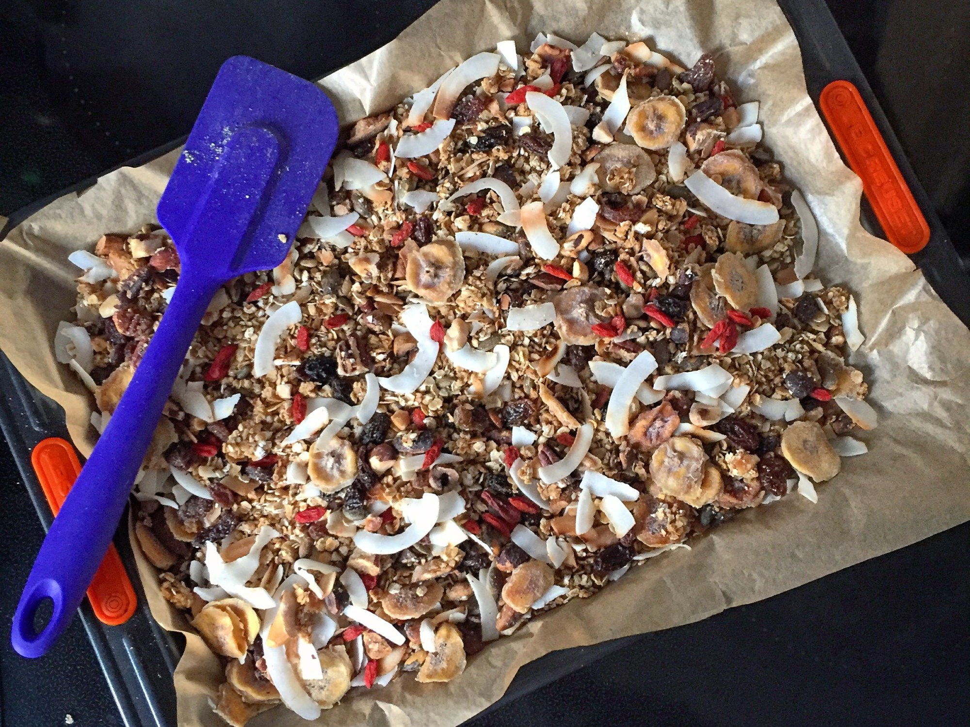 - Take out the oven and let it cool in the pan, sprinkling over your sultanas, banana chips, coconut and goji berries